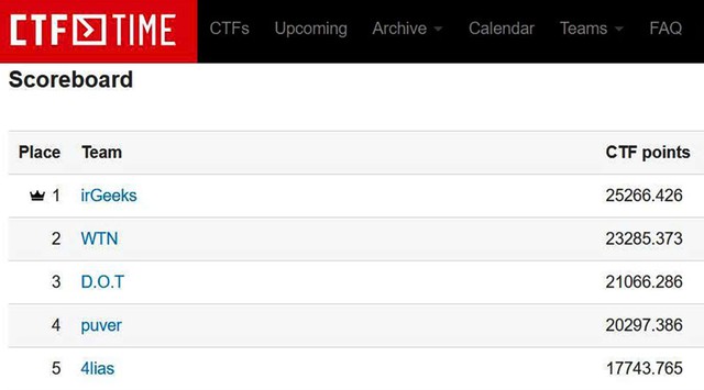 Iran Tech Olympics CTF 2025 là cuộc thi do Chính phủ Iran tổ chức với quy mô lớn và chuyên nghiệp. Sự kiện quy tụ hơn 1.100 chuyên gia công nghệ đến từ 16 quốc gia, bao gồm: Nga, Pakistan, Oman, Việt Nam, Thổ Nhĩ Kỳ, Tunisia, Iraq, Bangladesh, Azerbaijan, Ấn Độ, Liban, Indonesia, Romania, Algeria, Hà Lan và nước chủ nhà Iran.